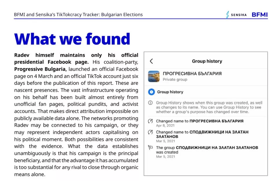 Докладът ясно заявява, че огромната инфраструктура в подкрепа на Радев е изградена почти изцяло от неофициални фен страници, политически коментатори и активистки акаунти.