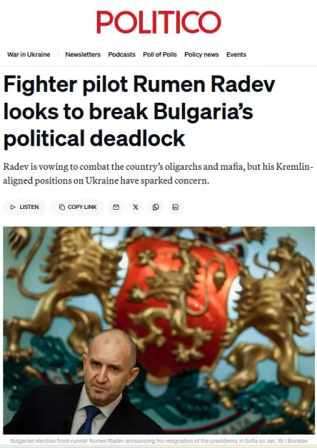 Анализът на авторитетната германска медия се допълва от европейското издание Politico. В свой анализ те поставят Радев в списъка на лидерите, които биха могли да заемат овакантеното от Виктор Орбан място на главен „нарушител на спокойствието“ в ЕС, наричайки го "българската непредсказуема карта" (Wild Card).