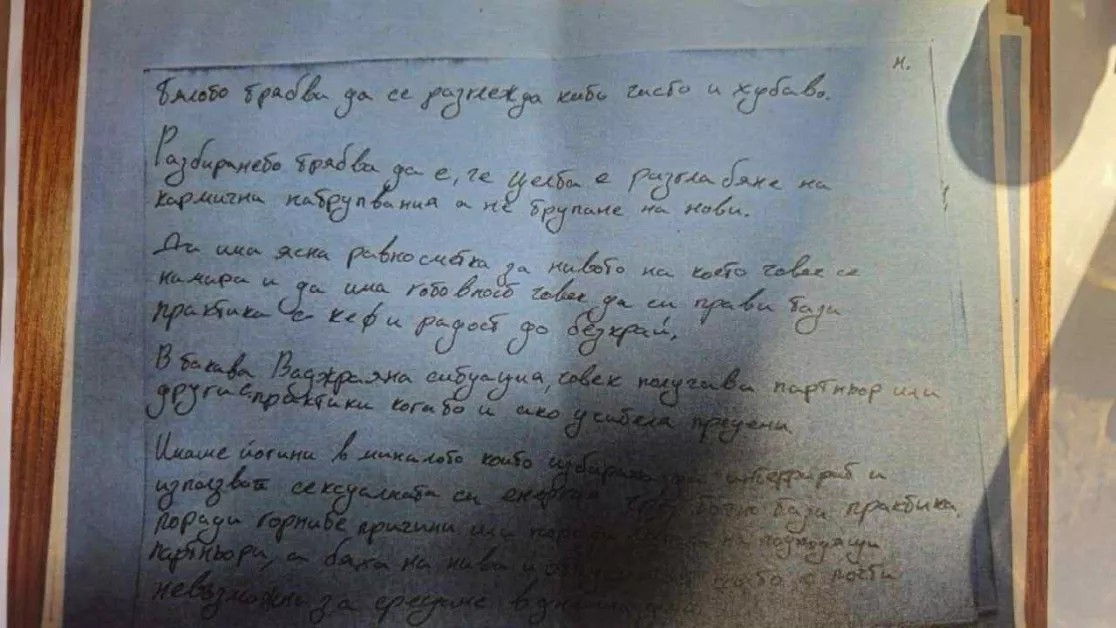 Бележки, които си е водил Ивайло Калушев преживе, са част от досието, което бе предадено от прокуратурата на депутати от Народното събрание. Ръкописите показват разностранните интереси на ламата , като съдържат разсъждения, свързани с религиозни и философски възгледи, размисли за сексуални практики, вината и „енергийните“ възприятия. Според източници, документът ще бъде подложен на експертен анализ, включително психолингвистична оценка, за да се установи дали може да даде допълнителен контекст за психическото състояние на автора в дните преди трагедията.