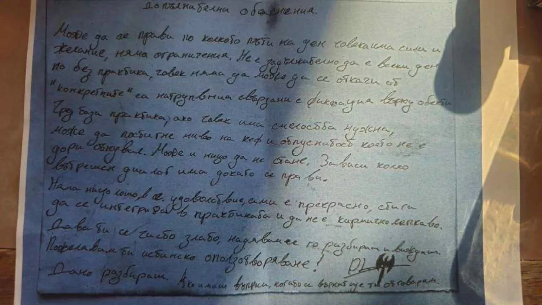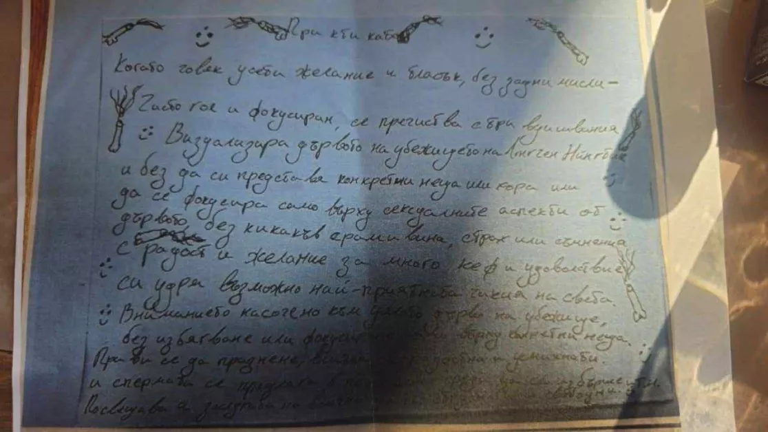 При обиските в хижата са открити доста бележки , които по първоначални данни принадлежат на водачът на групата Ивайло Калушев. Една от тях е озаглавена "Възход и Инструкции". "В чикии и секс няма нищо срамно или нередно. Чрез подсилване на сексуалната енергия в теб в миналото съм се опитвал да да ти помогна да поискам да го интегрираш всичко това, вместо да го криеш или да се правиш че я няма. Правенето на такива неща със Срам и Страх и всички ефекти е унищожително в енергиен план и е целен ефект от Църквата през вековете." Друга бележка , назована "Практиката" е осияна с нарисувани фалоси, а отдолу пише. "Когато човек усети желане и тласък - без задни мисли - чисто гол и фокусиран , се пречиства с три вдишвания. Визуализира дървото на убижището и без да си представя конкретни хора или неща или се фокусира само върху сексуалните аспекти от дървото без никакъв срам ивина с радост и желание за много кеф и удоволствие си удари възможно най- приятната чикия насвета. Практиките с партньор обаче са едни от най- опасните в Дхарма и са погубили страшно много хора. Изискват хората да са на изключително високо ниво, за да не бъде това духовен материализъм - много тежкокармично натрупване. "