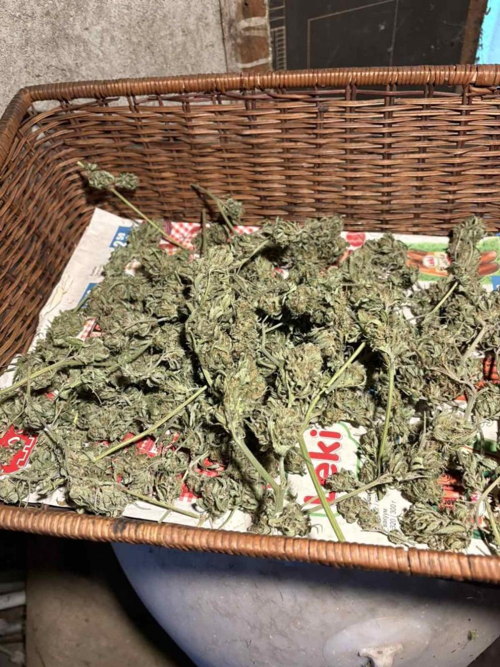 На място са намерени полиетиленов чувал и пластмасова кофа, пълни със зелена листна маса, а в прилежаща постройка - още 31 растения канабис, високи между 100 и 150 см, с множество съцветия, оставени за сушене.
