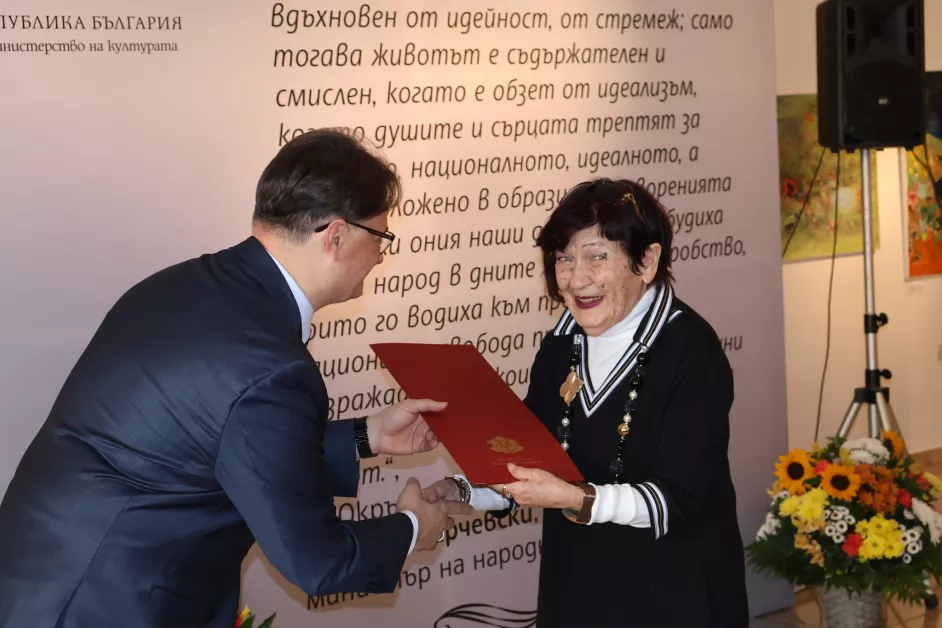 С награда на Министерството на културата за изключителен принос в развитието и популяризирането на българската култура и изкуство и по повод 1 ноември – Ден на народните будители „Златен век“ – огърлие и грамота са отличени: