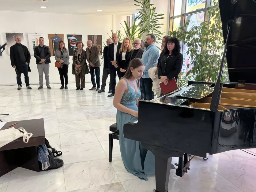 Музикален поздрав към участниците и гостите на церемонията направи ученичката Калина Грозева от НУМТИ "Добрин Петков" с изпълнение на пиано.