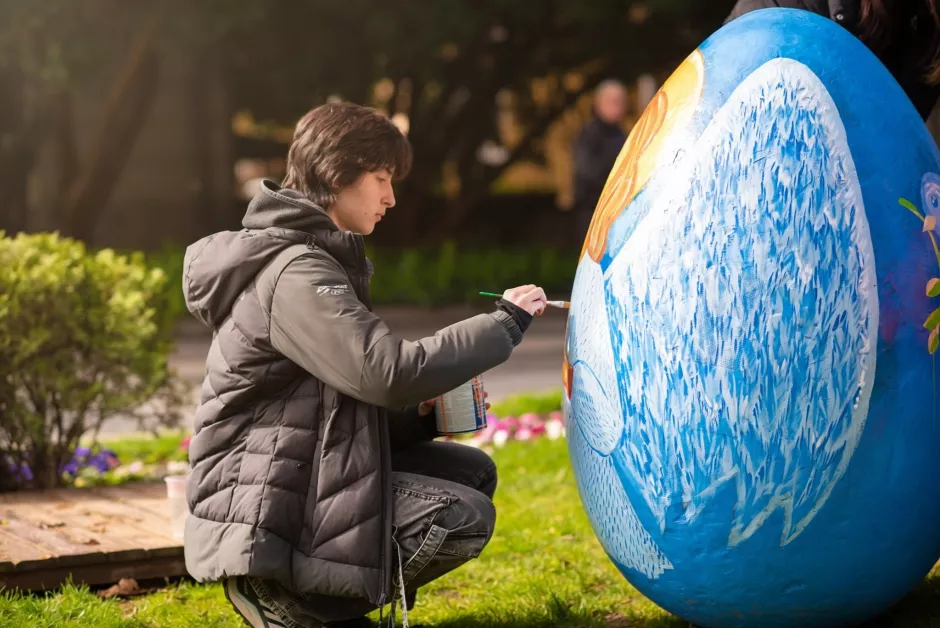Талантливите ученици от Националната гимназия за сценични и екранни изкуства, под вещото ръководството на преподавателя Димитър Къркеланов, днес вдъхнаха нов живот на 10 гигантски макета на яйца в зелените площи пред Община Пловдив. Пред очите на минувачите младите творци разгърнаха великолепни великденски сюжети, превръщайки площада в сияйна галерия на открито. Всяка година тези уникални арт инсталации се превръщат в любим фон за снимки и внасят усмивки в ежедневието на хиляди пловдивчани и гости на града.