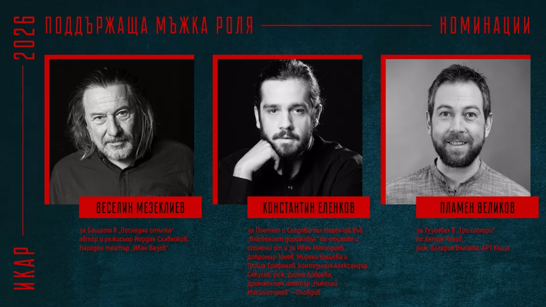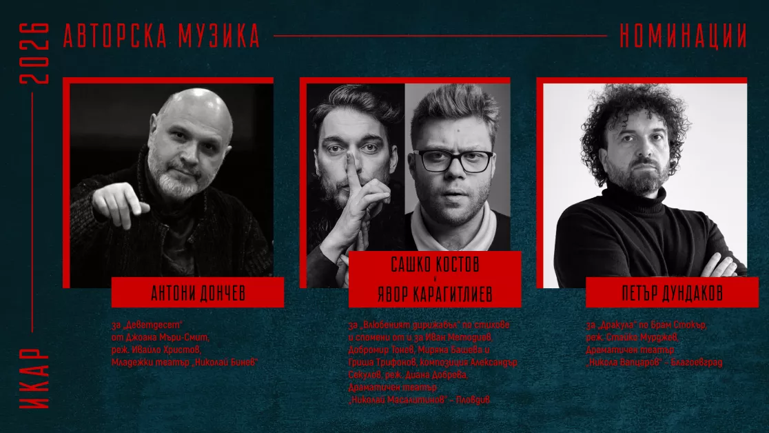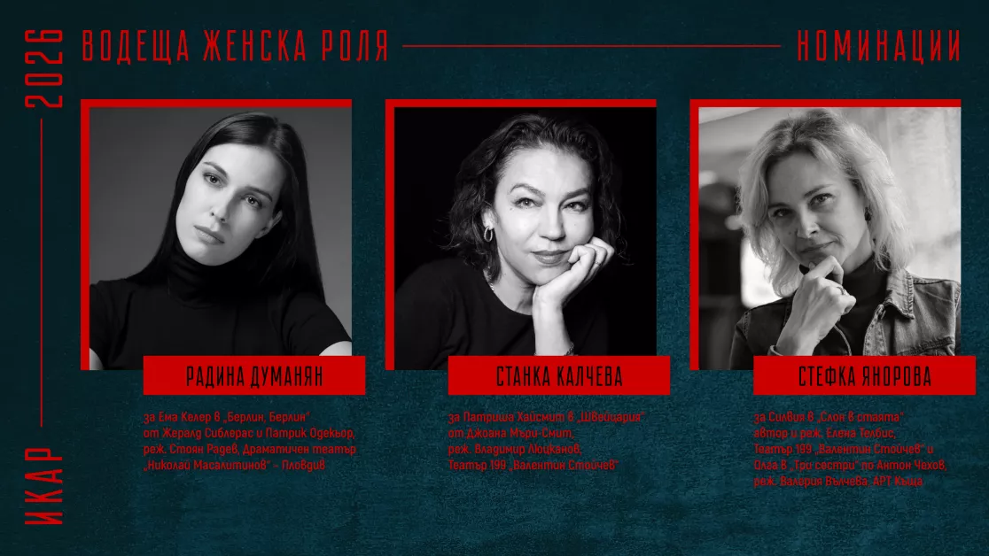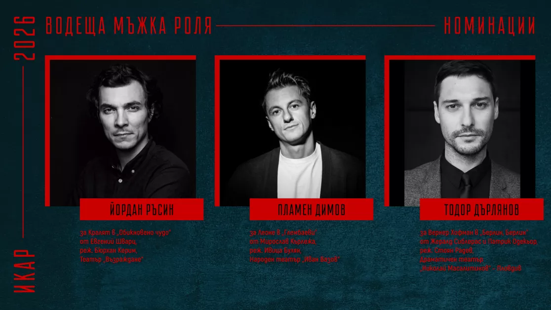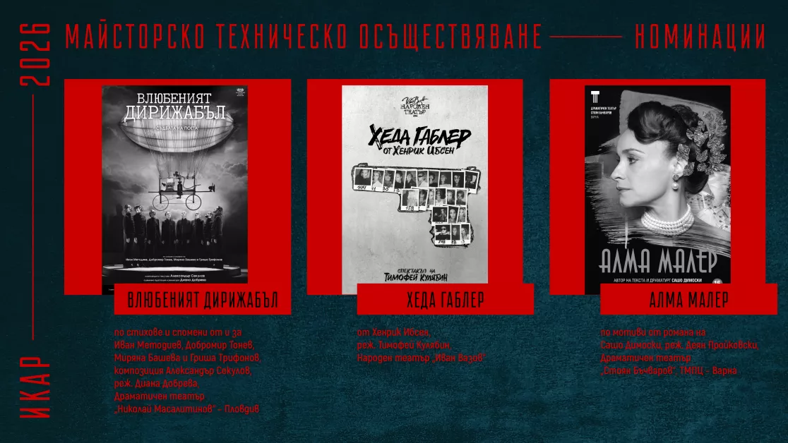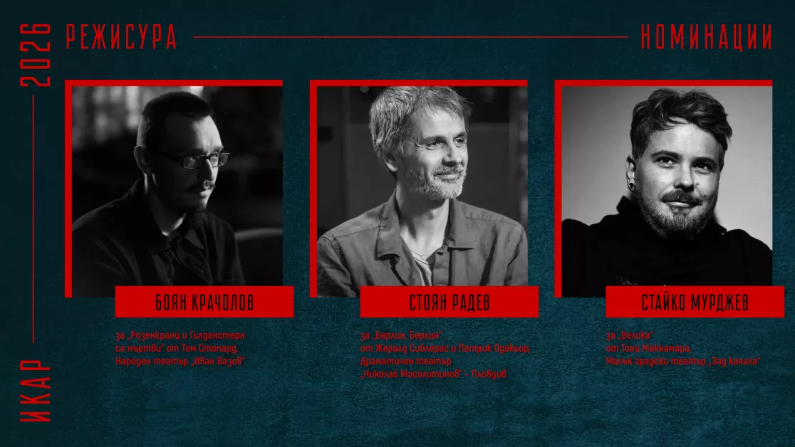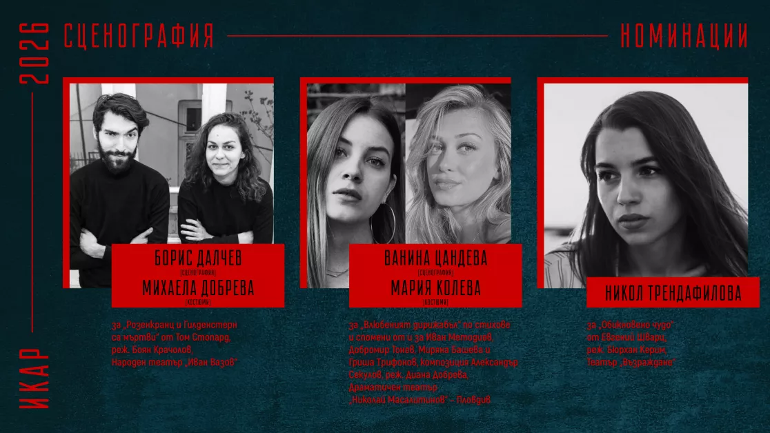 Номинациите за ИКАР 2026 са определени от комисии с участието на изявени артисти, театроведи, режисьори, сценографи и хореографи. След представяне на състава на комисиите, чрез специално видео бяха обявени номинираните във всички категории.