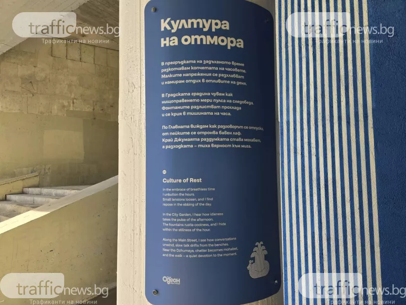Посетителите разгледаха и новите визии на подлеза, а зоната е наречена "Пасаж Одеон". Стените са украсени със стилизирани рисунки, в които са вплетени знакови за града символи - реката, древните паметници, а финалът е с пауна от Епископската базилика. Всяка от рисунките е придружена с поетичен текст. Автор на рисунките е Георги Василев, а на текстовете - Бояна Стоилова.