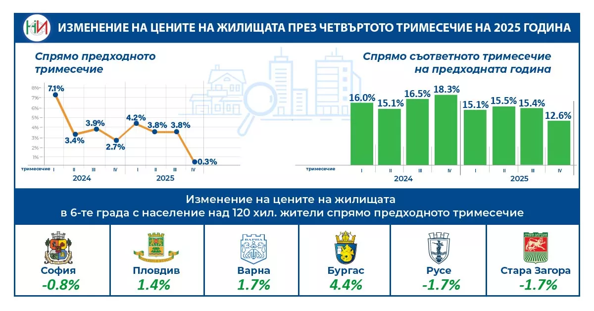 Паралелно с тези размествания в поведението на купувачите, статистиката отчита и умерено движение на цените. През четвъртото тримесечие на 2025 г. жилищата в Пловдив поскъпват с 1.4% спрямо предходното тримесечие – темп над средния за страната, където увеличението е едва 0.3%. На годишна база ръстът достига 8.6%, което остава под отчетеното поскъпване в София, Варна, Бургас и Стара Загора.