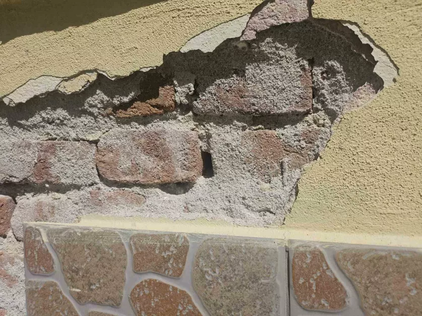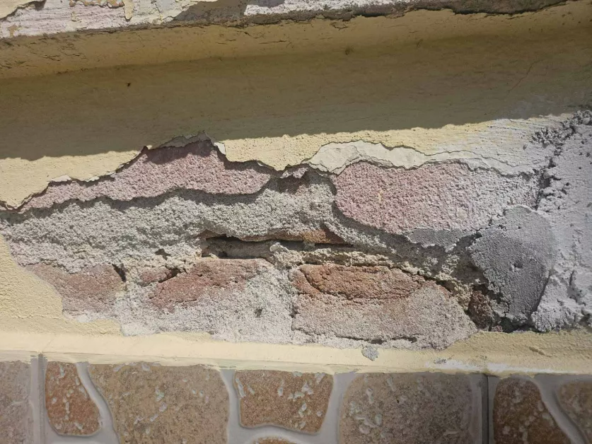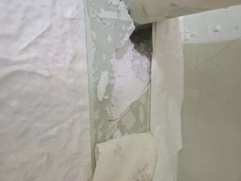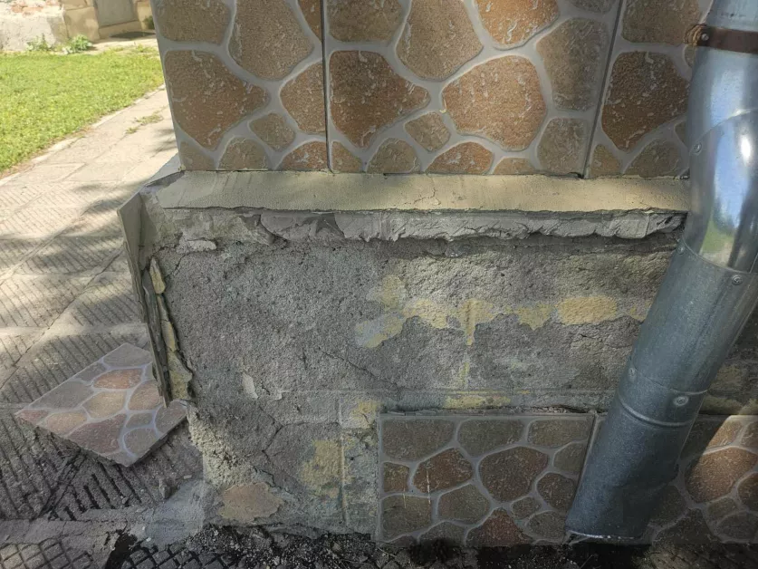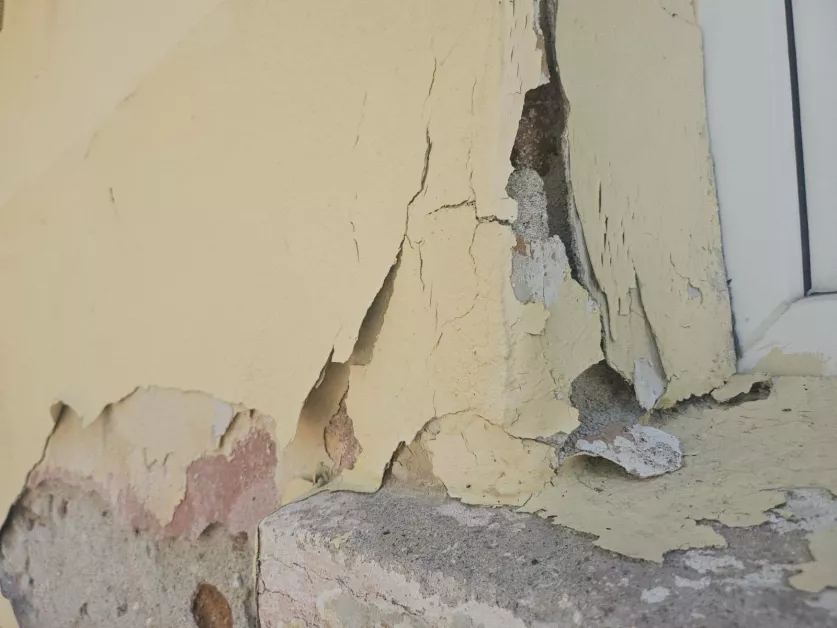Сградата е построена през 1955 година, а днес по нея ясно личат конструктивни нарушения – пукнатини и изпадала мазилка. Според експерти това не е просто козметичен дефект, а сериозен проблем, свързан с влагата, повлиян от високите подпочвени води в региона. Част от щетите са прикрити с декоративни пана по препоръка на Регионална здравна инспекция, но това не решава проблема.