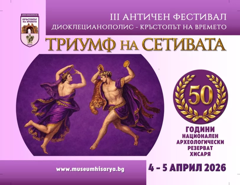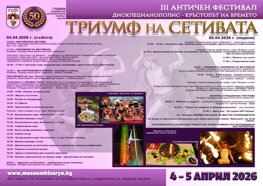 На 4 и 5 април Хисаря ще се превърне в сцена на живата история с провеждането на третото издание на Античния фестивал „Диоклецианополис – кръстопът на времето“. Тазгодишното издание ще протече под мотото „Триумф на сетивата“. Събитието е част от културния календар на Археологически музей – Хисаря и тази година носи специален заряд, тъй като е посветено на 50 години от обявяването на Античния град за Национален археологически резерват на 19 ноември 1976 г.