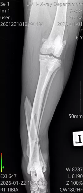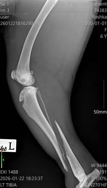Диагнозата е тежка – две сериозни фрактури на задните крайници в областта на пищялите, с разместване и травмирани меки тъкани. По думите на ортопеда съществува реален шанс фрактурите да бъдат фиксирани с импланти и винтове, което би позволило на Рошка отново да проходи.
