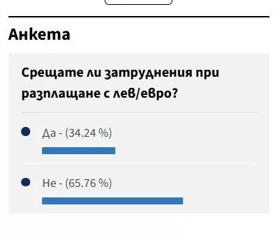 На въпроса „Срещате ли затруднения при разплащане с лев/евро?“ 65,76% от анкетираните отговарят отрицателно, което сочи, че двойното обращение се възприема сравнително спокойно от мнозинството.