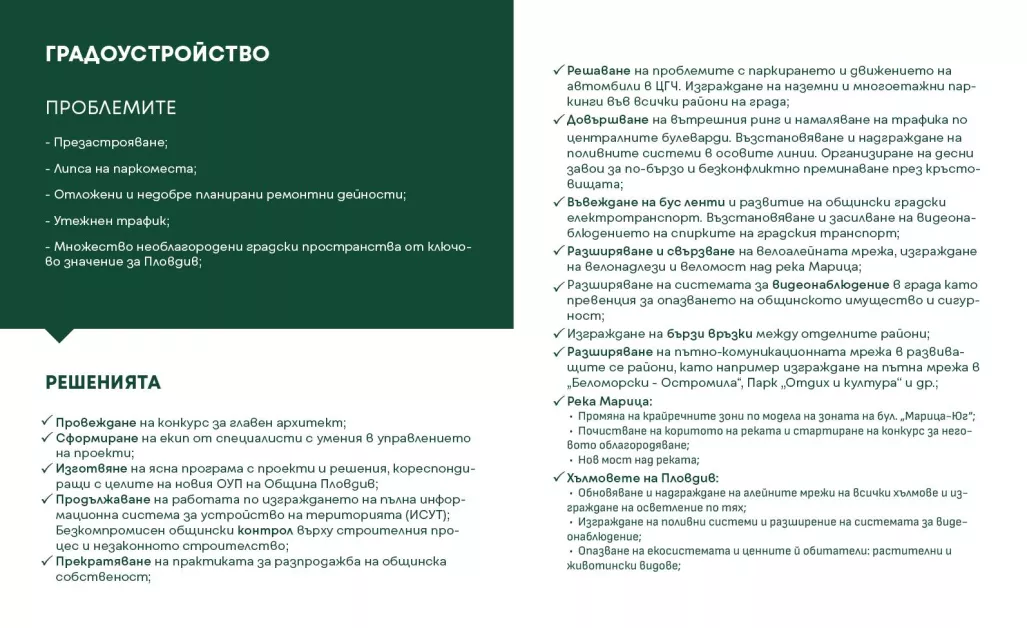 ✓ Изготвяне на ясна програма с проекти и решения, кореспондиращи с целите на новия ОУП на Община Пловдив;