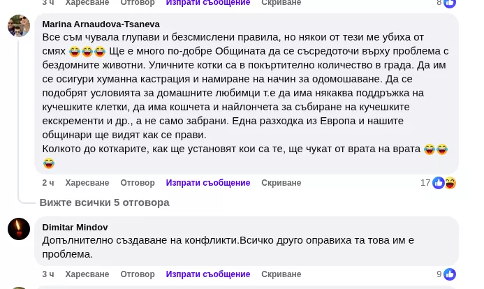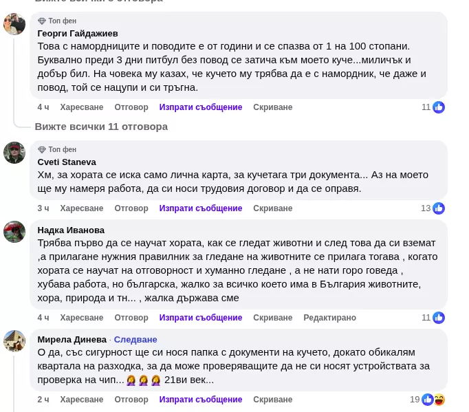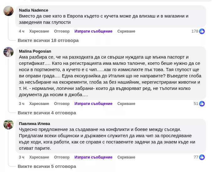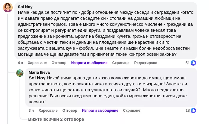 Сред най-критичните мнения, но събрало най-голямо одобрение от потребителите, е това на пловдивчанка, която пише, че предлаганите мерки дават възможност съседите да упражняват административен натиск един върху друг, вместо да подобряват отношенията между хората. Според нея се насърчава „комунистическо мислене, в което граждани контролират граждани“, а това, по думите ѝ, ще доведе до повече напрежение, бездомни животни и злоупотреби.
