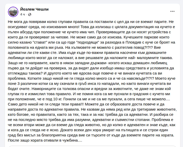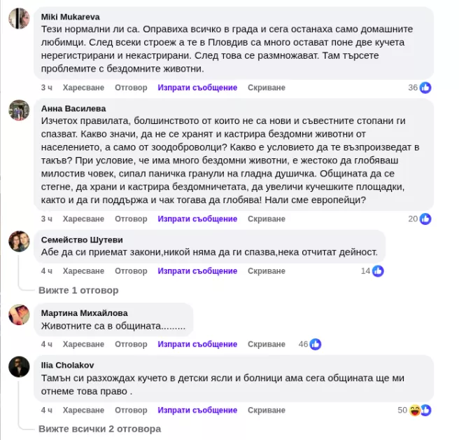 Остри реакции и критики към Община Пловдив разпалиха социалните мрежи. За броени часове след публикуването на материала на TrafficNews за подготвяната нова наредба, която разписва правилата за отглеждането и разхождането на домашни любимци, стопани се впуснаха в дискусии. Стотиците коментари под публикацията разкриха масово недоволство, като хората възразяват срещу редица от разписаните правила.