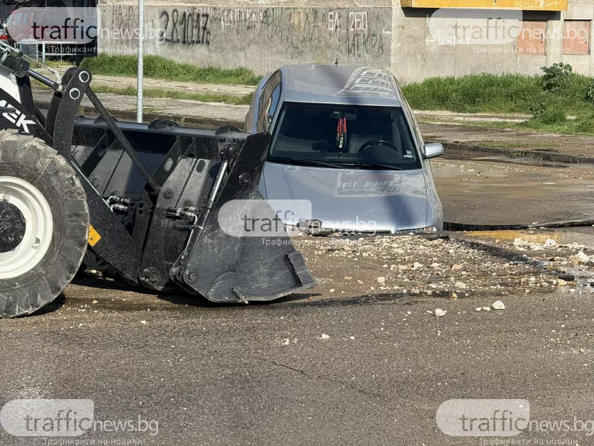 Цялата ѝ предница в потънала в пътното платно, а според очевидци заради огромното наводнение, дупката е била скрита под вода и не се е виждала.
