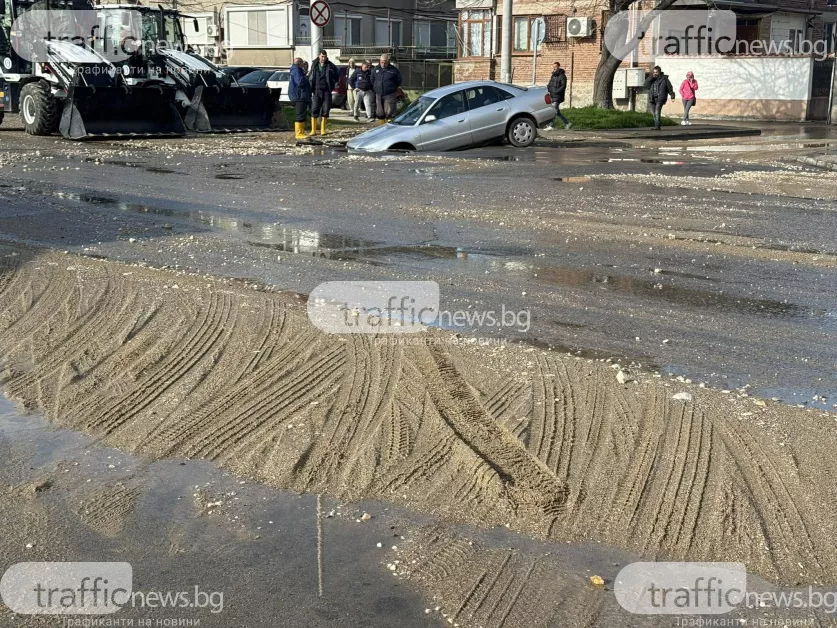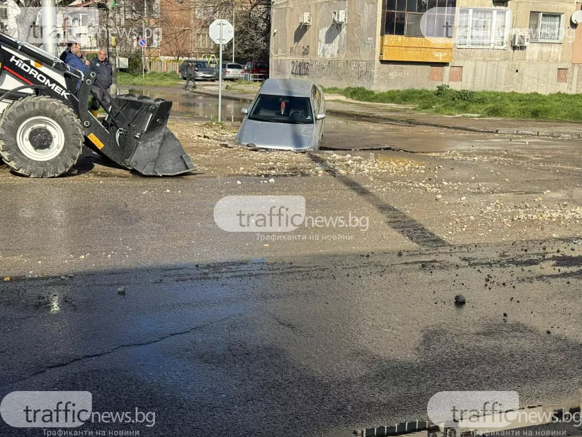 Огромна ВиК авария наводни ул. "Ландос" в кв. "Изгрев". Кола е пропаднала в огромна дупка, отворила се при пропадането на асфалта заради аварията.