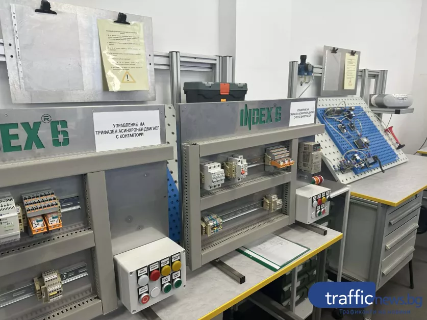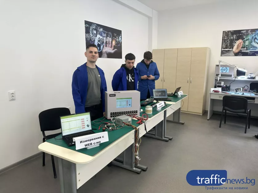 Реалната сила на новия център пролича най-ясно в демонстрациите на учениците. Дванадесетокласникът Васил Николов представи учебно табло с PLC система, HMI интерфейс и възможности за симулации на индустриални процеси като светофарни уредби, водни съоръжения и автоматизирани линии.