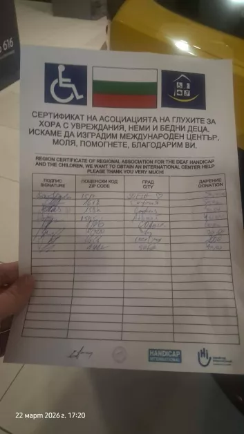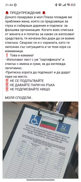 Поредна вълна от измами, извършвани от хора, представящи се за „глухонеми“, тревожи граждани и търговци в Пловдив. Сигнали за подобни случаи отново се разпространяват активно в социалните мрежи, най-вече във Facebook групи, където потребители предупреждават за добре позната схема. По информация на потърпевши, измамниците обикалят магазини, паркинги и оживени обществени места, като се представят за хора с увреден слух. Те подават на случайни граждани листове с текст- "Сертификат на асоциацията на глухите за хора с увреждания, неми и бедни деца. Искаме да изградим международен център. Моля, помогнете, благодарим ви" , а отдолу се субират подписи и данни на пловдивчаните, ако решат да се подпишат и да дарят. Групата, които са украинци използват жестове, за да внушат, че събират средства за благотворителна кауза или лични нужди. В много случаи разчитат на съчувствието и добрата воля на хората, за да получат пари.