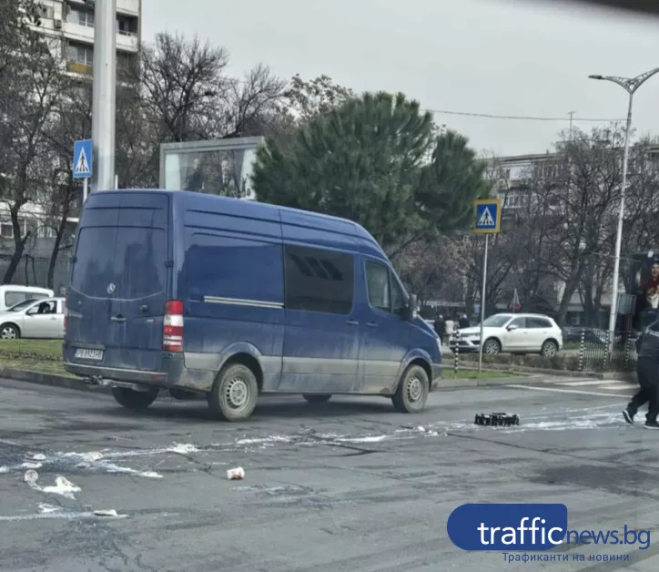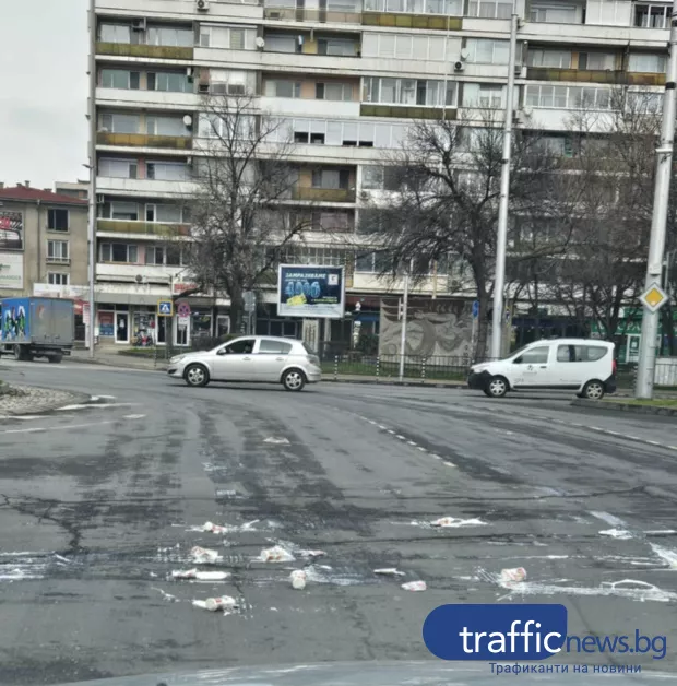 Две касетки с кисело мляко са се изсипали от бус в движение, след като вратата на превозното средство ненадейно се отворила. Резултатът – бяла диря от разпръснати и спукани кофички, които буквално „гарнирали“ асфалта.