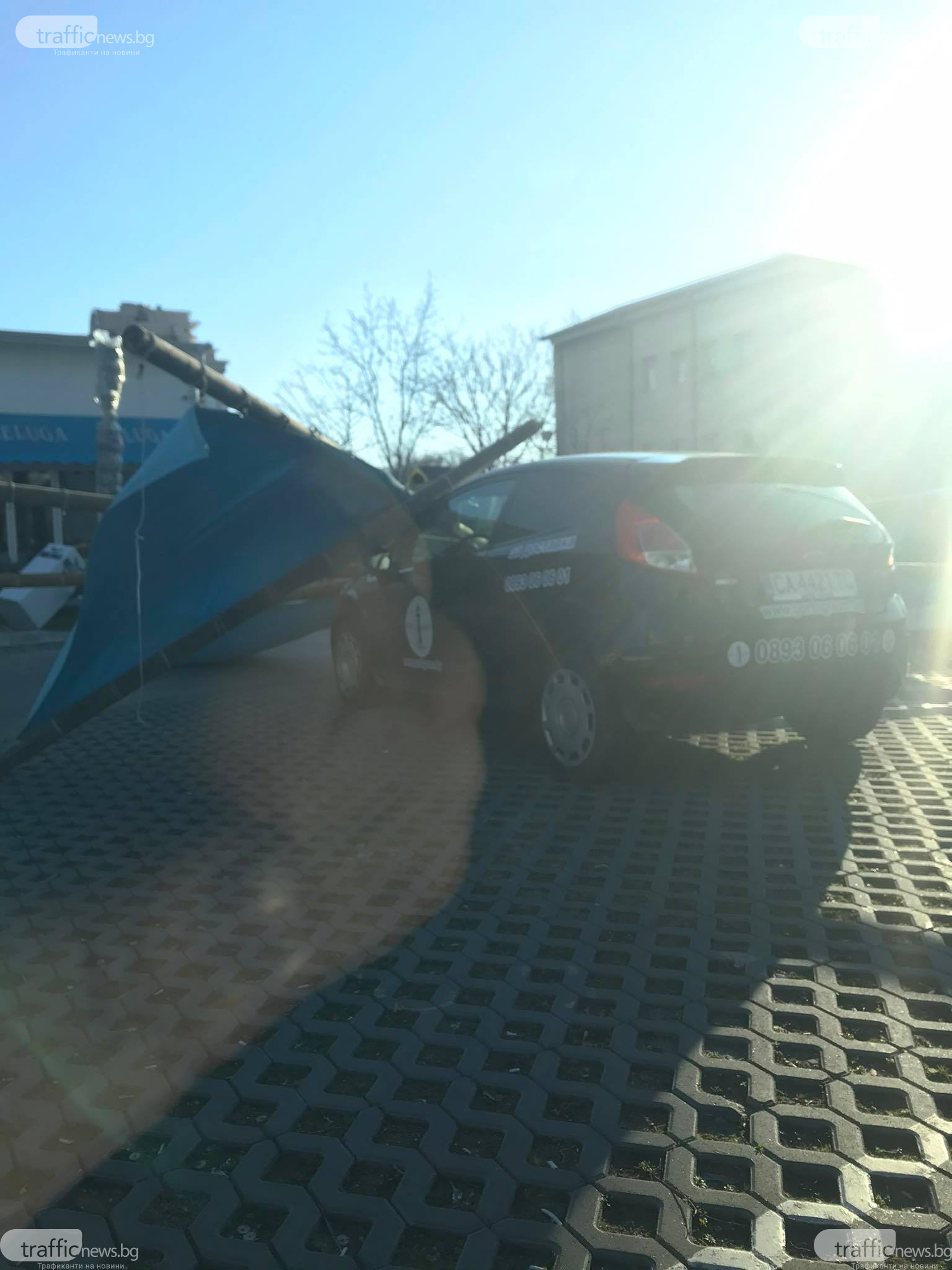 Силният вятър продължава да нанася щети в целия град. Макет на вятърна мелница, декор на гръцки ресторант в района на парк Лаута, се е стоварил върху паркирана кола. Нанесените щети по превозното средство не са сериозни.