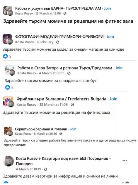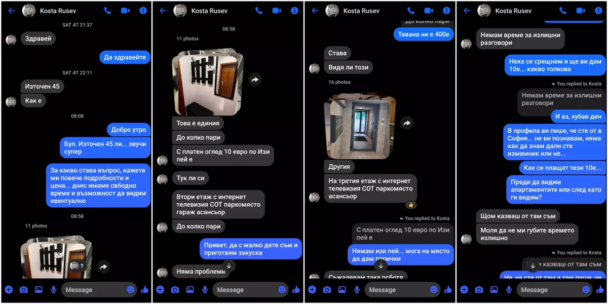Мъж, подвизаващ се под името Коста Русев във фейсбук, пише на хора, които търсят имоти в специализирани групи в социалните мрежи. Предлага им апартаменти, а ако се харесат на потенциалните наематели, уточнява че огледът струва 10 евро, преведени в аванс по Изипей.