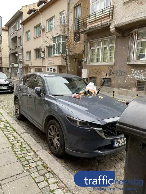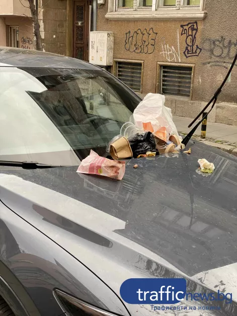 Недоволен пловдивчанин, забелязал нарушението, е решил да изрази възмущението си, като вдигне чистачките на автомобила. Освен това той е изсипал различни боклуци върху капака – вероятно извадени от близките контейнери, разположени непосредствено до мястото на паркиране.