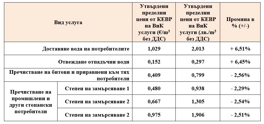 - Доставяне на вода: 2,013 лв./куб.м (1,029 €) – увеличение с 6,51%.