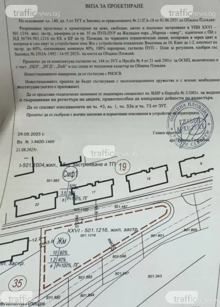 Обектът, в който се извършват дълбоките изкопни работи, е ситуиран в имот УПИ XXVI – 501.1216. Има разрешение за строеж от края на 2025 година. Според визата за проучване и проектиране, издадена на 29 август 2025 г. от главния архитект на район „Северен“ Рамона Георгиева, е разрешено свободно, ниско застрояване с височина до 10 метра и плътност на застрояване до 60%.