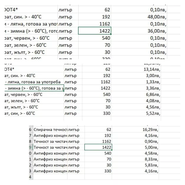 Антифризът, концентрат за – 40 градуса пък би се взел от Община Пловдив, ако избере фирма „Марком“, срещу 48 лева на литър без ДДС! Останалите две оферти за същия продукт са 3 лева и 4,16 лева без ДДС, колкото са и в търговската мрежа.