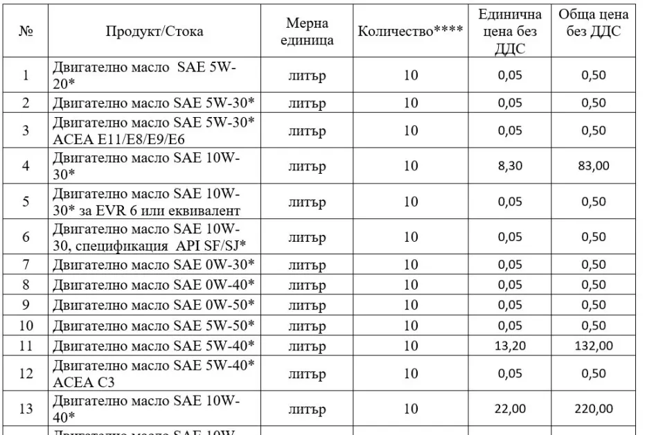 Така например по оферта „Марком“ предлагат Двигателно масло SAE 15W-40* срещу 22,40 лева без ДДС за литър, а класираната на второ място - „Диком“ за същото масло е дала цена от 8,47 лева без ДДС. Третата компания пък е предложила сумата от 11,05 лева без ДДС за него.