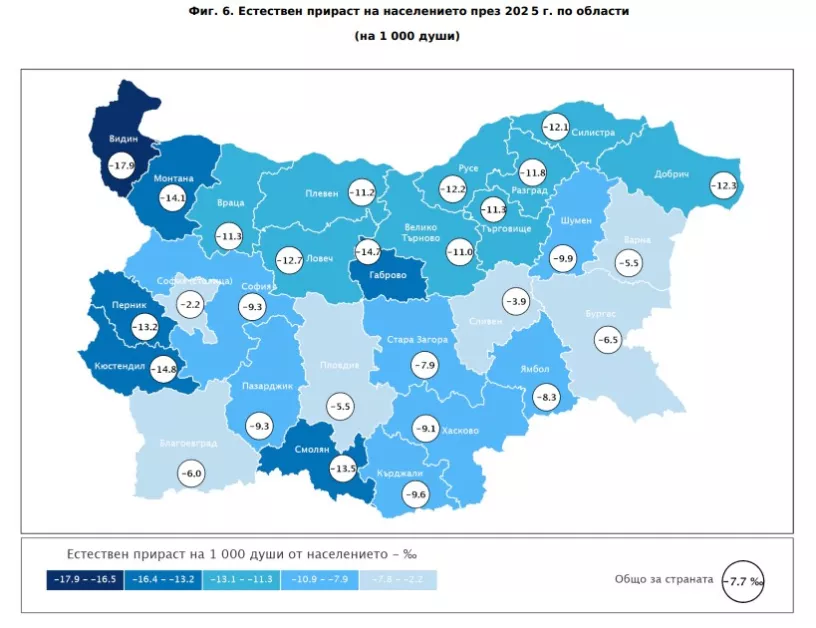 Към края на 2025 г. населението на България е 6 423 207 души – с над 14 хиляди по-малко спрямо година по-рано. Спадът може да изглежда умерен като абсолютна стойност, но зад него стои трайна тенденция, която продължава вече десетилетия. Основният фактор остава отрицателният естествен прираст - през 2025 г. разликата между родените и починалите е близо - 49 000 души. С други думи – населението намалява не защото хората напускат страната, а защото умират повече, отколкото се раждат. Този процес е характерен за всички области без изключение.