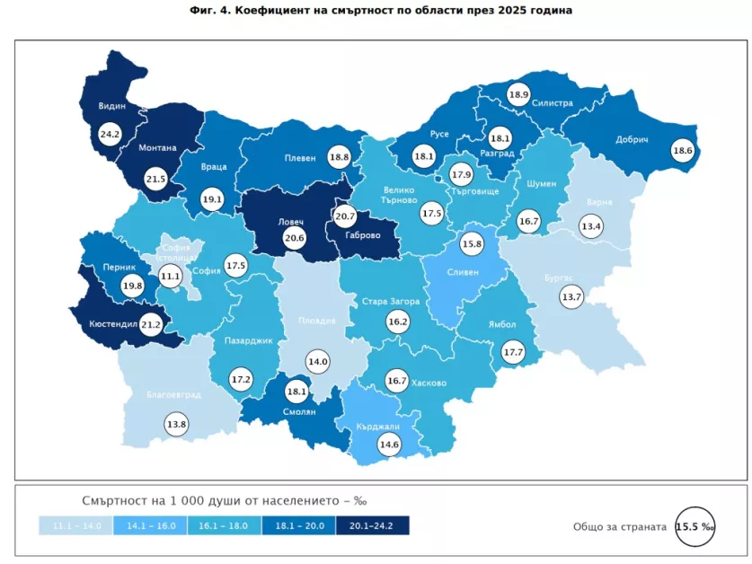 На национално ниво през 2025 г. са починали 99 479 души. Смъртността остава по-висока при мъжете, а разликата между градове и села е съществена – в селата показателите са значително по-неблагоприятни .