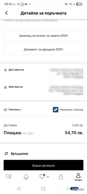 Поръчката пристига в офис на куриерска фирма на 19 януари 2026 г., когато съпругът отива да я получи и заплати. Той не е бил предварително информиран за крайната сума, която ще трябва да плати. На място обаче се оказва, че дължимата сума е 54,70 евро, което по курса се равнява на 106,98 лева – почти два пъти повече от посоченото в приложението. Плащането е извършено с банкова карта, като за транзакцията има наличен платежен документ.