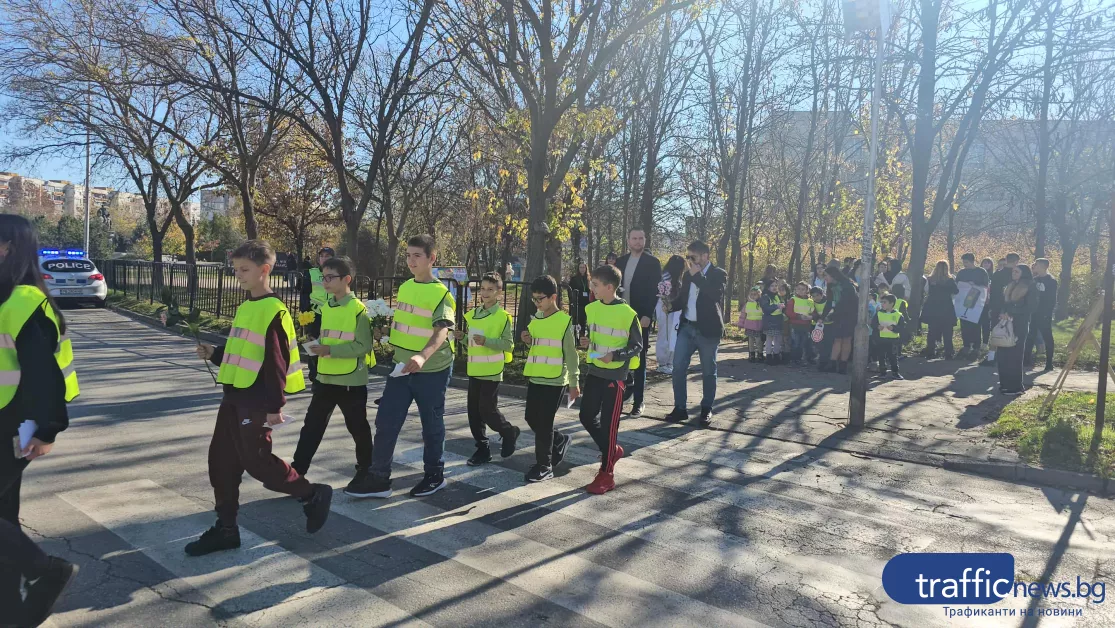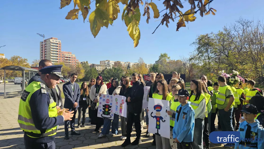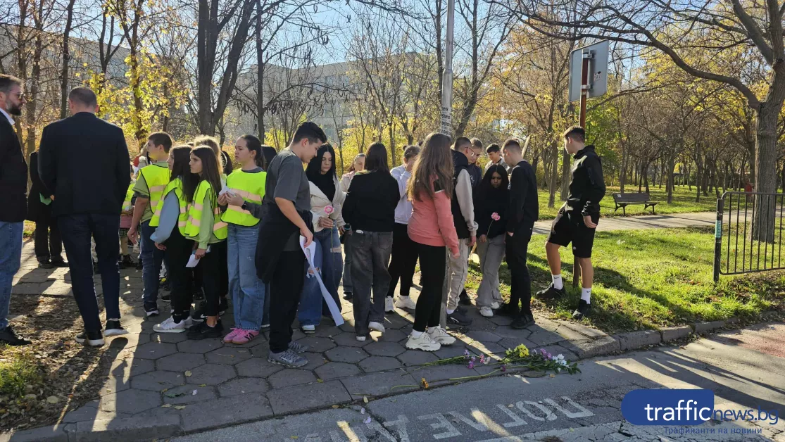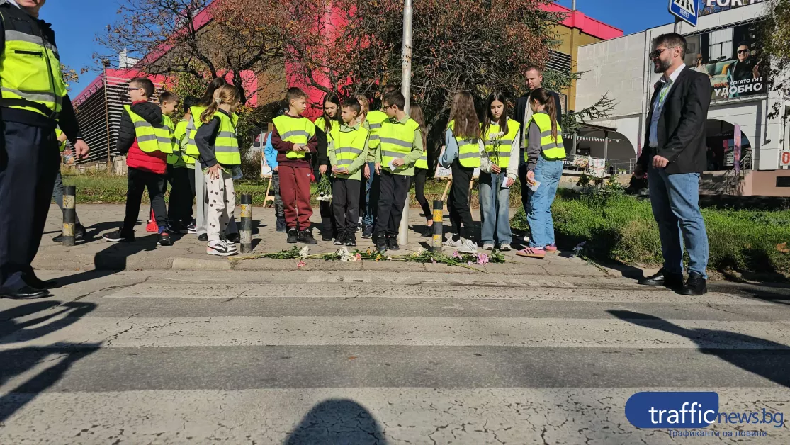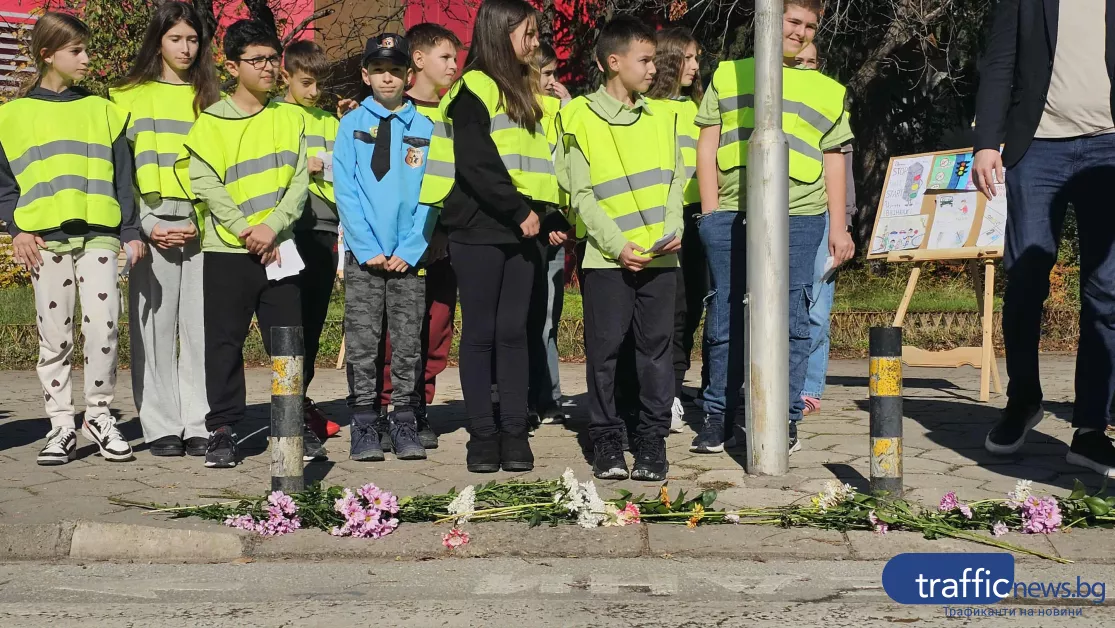 Деца от първи и четвърти клас изградиха „жива“ пешеходна пътека на улица „Съединение“, пред СУ „Софроний Врачански“ в Пловдив. Малчуганите положиха цветя на асфалта и тротоара в памет на загиналите в тежки пътни произшествия. Движението бе спряно от служители на Пето районно управление, партньори в инициативата.