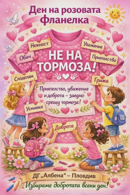 Много усмивки, розов цвят и силни послания срещу насилието – така деца от пловдивската ДГ „Албена“ отбелязаха Денят на розовата фланелка. Световната инициатива срещу тормоза обедини малчуганите и техните учители около каузата за повече доброта, уважение и съпричастност.
