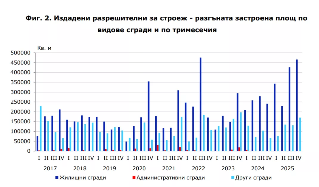 На годишна база увеличението е още по-ясно изразено. В сравнение с година по-рано - четвъртото тримесечие на 2024 г., издадените разрешителни за жилищни сгради са станали с 30 % повече, а предвидените апартаменти и разгънатата застроена площ се удвояват.
