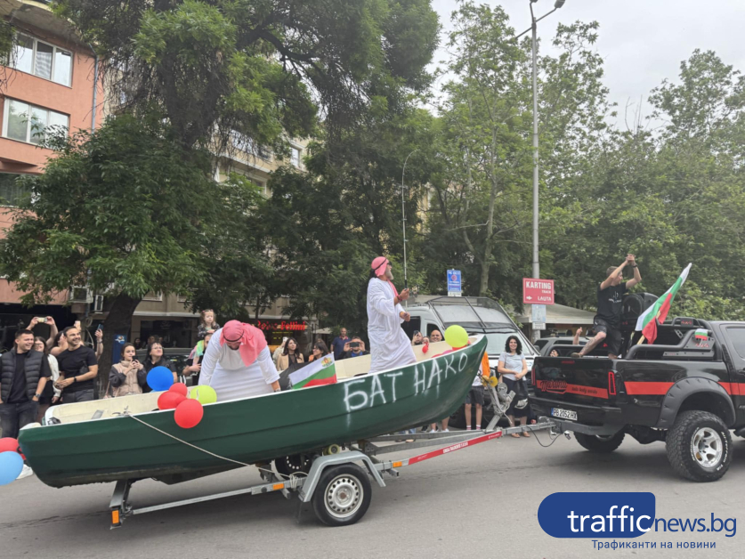 С лодка, шейхове и въдици - така пристигна Атанас Панчев от Търговската гимназия на своя бал тази вечер. Абитуриентът успя да прикове погледите не само на присъстващите пред Новотела, но и на пловдивчани по булевардите.