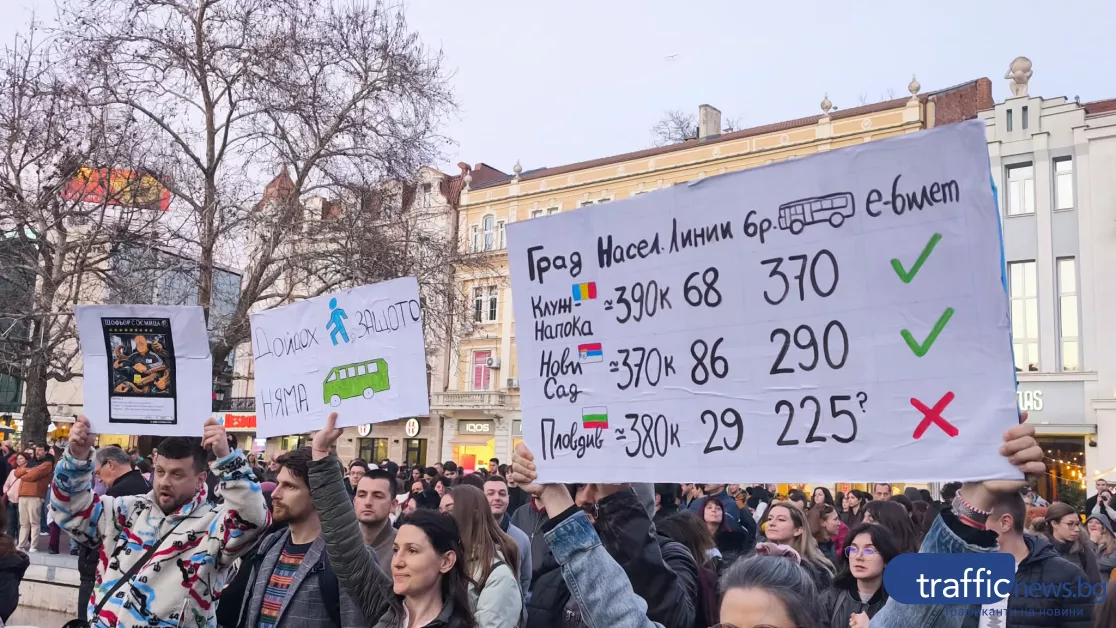Скандирания „Стига чакане“ и „Искаме транспорт“ огласиха тази вечер пространството пред сградата на Община Пловдив, където стотици граждани се събраха на протест срещу състоянието на градския транспорт. Хора от различни възрасти изпълниха площада с плакати и настоявания за по-чести курсове, предвидими разписания и реални решения на проблеми, които според тях се трупат от години.