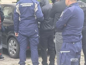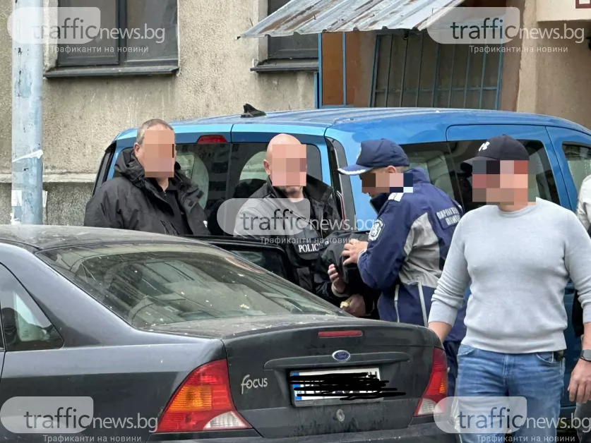 От апартамент в блока полицаи изведоха задържан мъж с белезници. Той беше облечен с черно яке с качулка, а лицето му остана скрито през цялото време. Паралелно с това служителите на реда извършиха обиск на черен автомобил, паркиран пред сградата, за който се предполага, че е свързан със задържания или негов близък.
