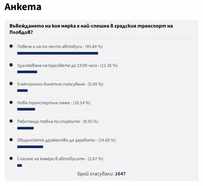 Резултатът от анкетата обаче е поредното потвърждение, че темата остава изключително чувствителна за пловдивчани и въпреки протестите, заявените приоритети и новите автобуси на терен – хората очакват видима промяна в ежедневното си придвижване из града.