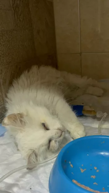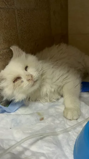Докторите установили,че вероятно от прекарана инфекция са му изтекли очичките и е сляп. Страда от анемия и микроплазма в резултат ухапвания от бълхи.