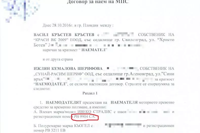 По думите на Шерифова, макар влекачът да е лицензиран към „СУНАЙ – РАСИМ ШЕРИФ“ ООД, той реално се използва от друга фирма на база валиден договор за наем. Тя предостави документите за наем на МПС, подписани още през 2016 година, чрез нотариус, с който влекачът е предаден за ползване на дружеството „КРАСИ ВК 2009“ ЕООД.