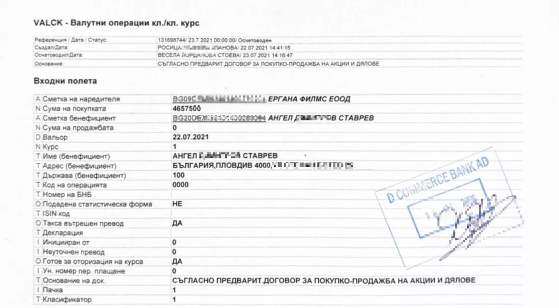 Той показа два документа, от които е видно, че от „Ергана филмс“ са платени 4 657 500 лева, а след това още 22 500 лева към Ангел Димитров Ставрев на 23.07.2021 г. Основанието е предварителен договор за покупко-продажба на акции и дружествени дялове.
