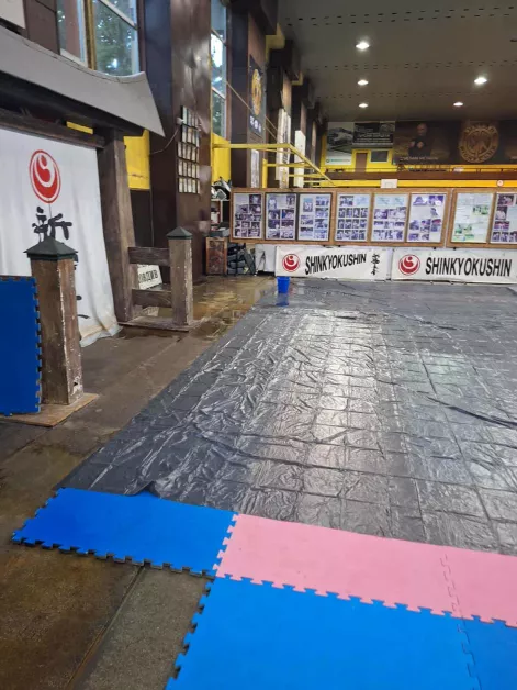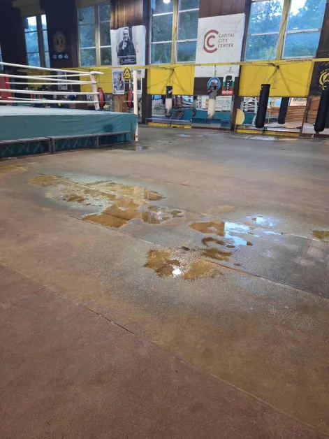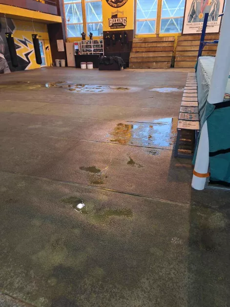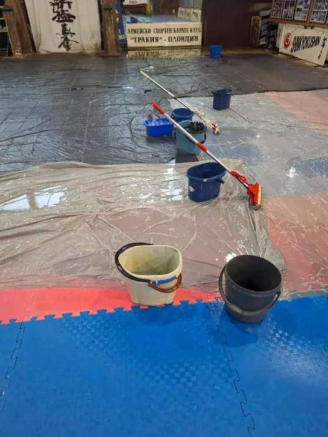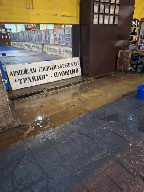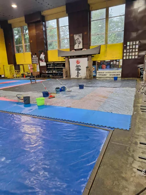 Вместо да тренират – деца са хванали кофи и парцали и отводняват спортна зала, която се е превърнала в басейн. Тази срамна гледка е в залите по бойни спортове на бул. „Източен“ 10, чийто ремонт бе планиран още в началото на годината.