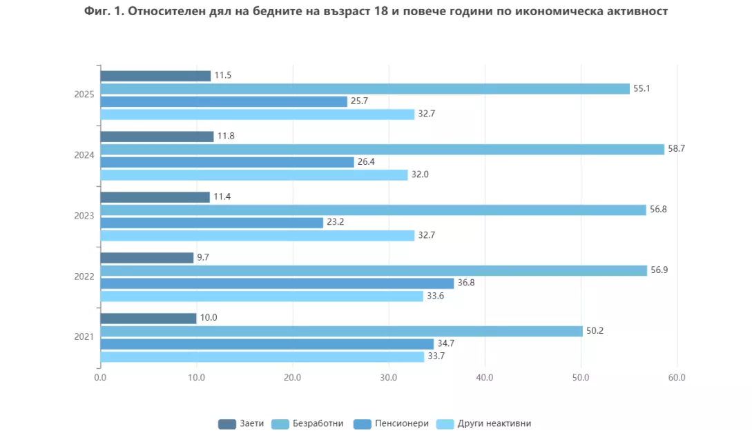 Най-висок остава делът на бедните сред безработните – 55.1%. При работещите ситуацията изглежда по-стабилна, но не и еднозначна – 11.8% от заетите попадат под линията на бедност, а при непълната заетост рискът е близо три пъти по-висок. Това очертава сегмент от „работещи бедни“, който се разширява именно при по-нискоквалифицирания труд.