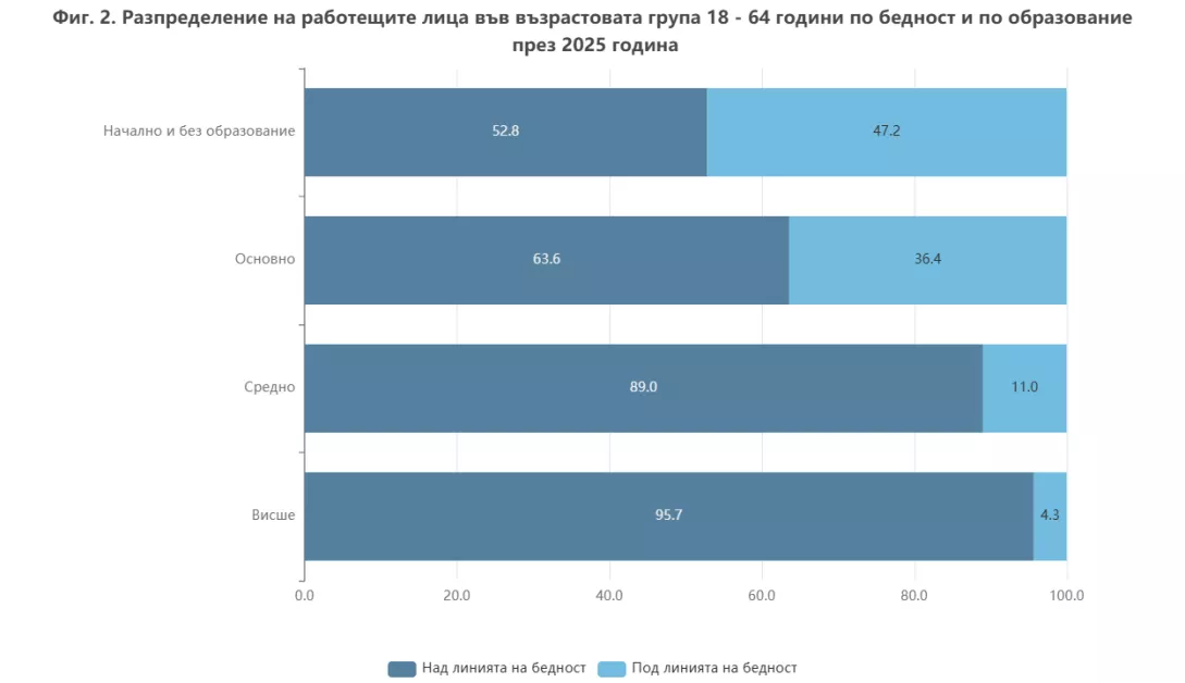 Образованието остава най-силният защитен фактор, сочи анализ на данните. Почти половината от заетите с начално или без образование са бедни, докато при висшистите делът е около 4%.