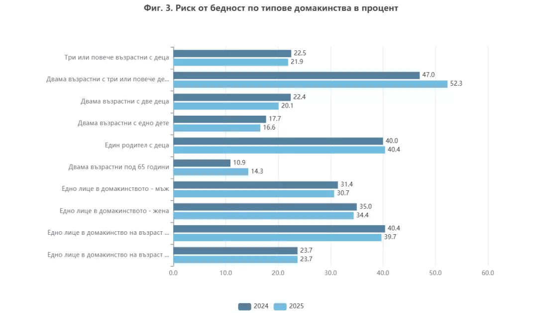 По структура на домакинствата рискът се концентрира при големите семейства и самотните родители – съответно над 50% и около 40% бедност. На този фон материалните лишения допълват картината. Над 40% от домакинствата не могат да посрещнат неочакван разход, близо толкова не могат да си позволят почивка, а около една пета срещат затруднения с текущи разходи като сметки за жилището. Индикаторът за тежки лишения обхваща 15% от населението, което означава системни ограничения в ежедневието.