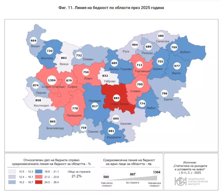 Регионалните различия остават значими. Линията на бедност варира от около 580 лева в най-слабите области до над 1300 лева в София, като разликите отразяват както доходите, така и цените на живот в отделните региони.