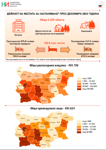 Броят на пренощувалите лица се увеличава с 4.3% в сравнение със същия месец на 2022 г. и достига 493.0 хил., като е отчетено увеличение при българските граждани със 7.5% и намаление при чуждите граждани с 4.6%. Нощувалите български граждани са 375.8 хил. и са реализирали средно по 1.9 нощувки. Чуждите граждани са 117.2 хил., със средно по 2.3 нощувки, като 76.5% от тях са пребивавали в местата за настаняване с 4 и 5 звезди