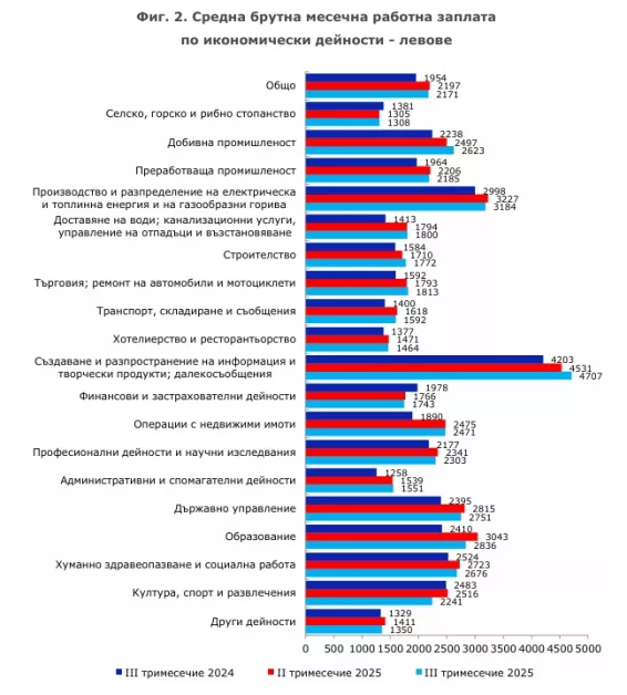 На второ място по доходи е енергийният сектор със 3184 лв., следван от образованието, където средната заплата е 2836 лв. Въпреки това именно образованието отчита един от най-големите спадове в заплащането за периода – почти 7%, което се дължи на приключването на допълнителни дейности през летните месеци.